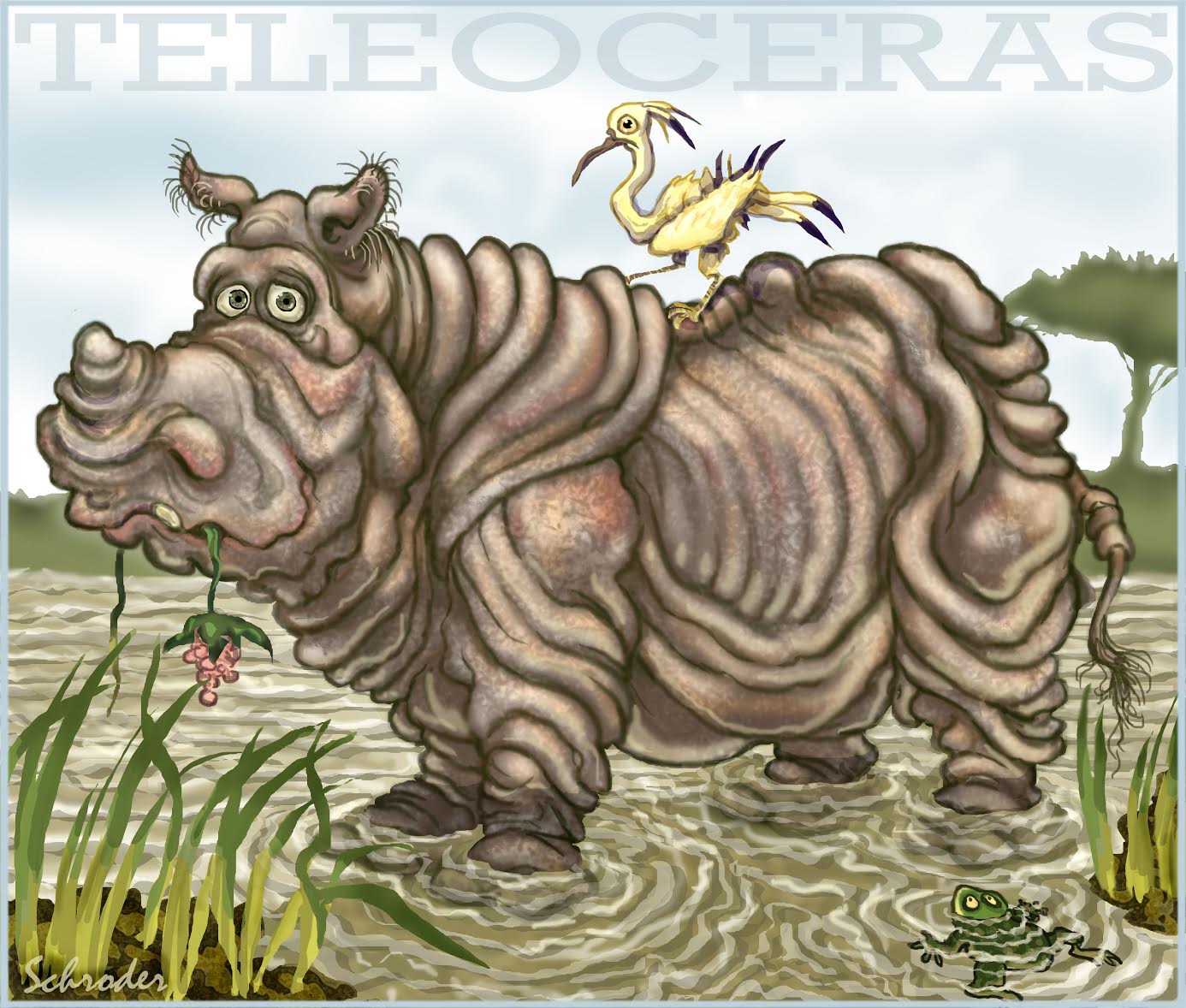12-3 teleocerasBack in the day, say 16 million years ago, We were one huge family, occupying the banks of various rivers and pools all over today’s North America. We lived in the water, like hippos, and also on the shore, grazing at leisure. There were no hippos in Nebraska (nor are there many today), and We occupied that bio-slot. Happily.