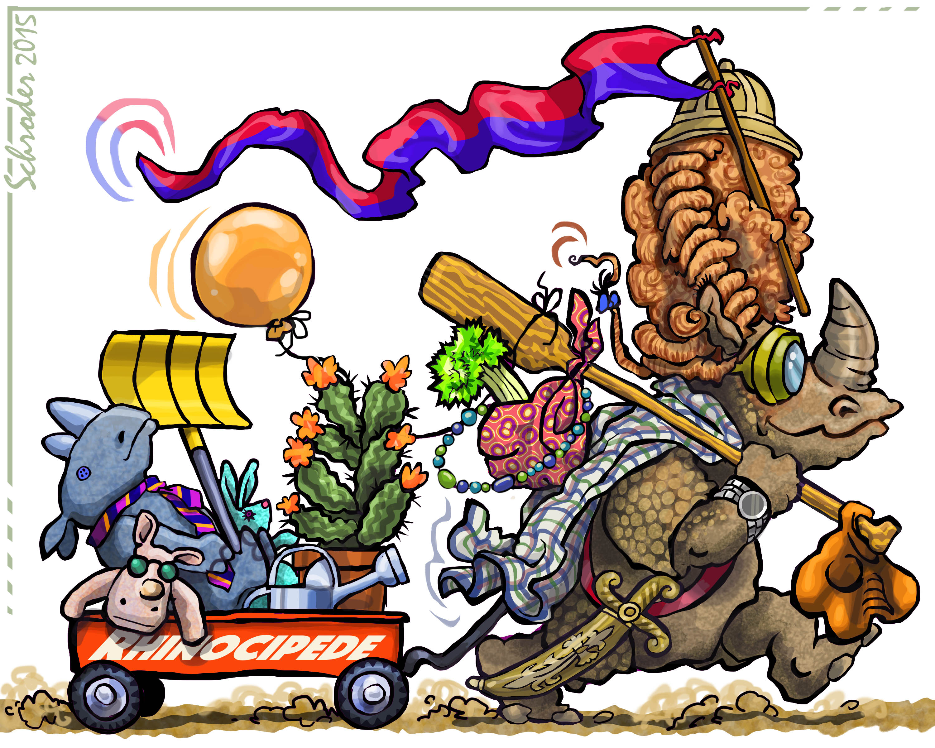 Clearly Rhino has been watching Sabret and I take our morning walk. She carries her lead, her flea-chasing amber necklace, her Southwest print collar, her reversible St. Francis/St. Anthony (traditional finder of lost things) medal, and her shoulder chip (tech finder of lost things.) I carry my cane, a camera, binoculars, a Kindle reader, doggy cleanup bags, a bag for stashing fabulous finds (pine cones, feathers, shells both avian and sea, and glittery rocks), and my glasses. Quite the intrepid adventurers we.