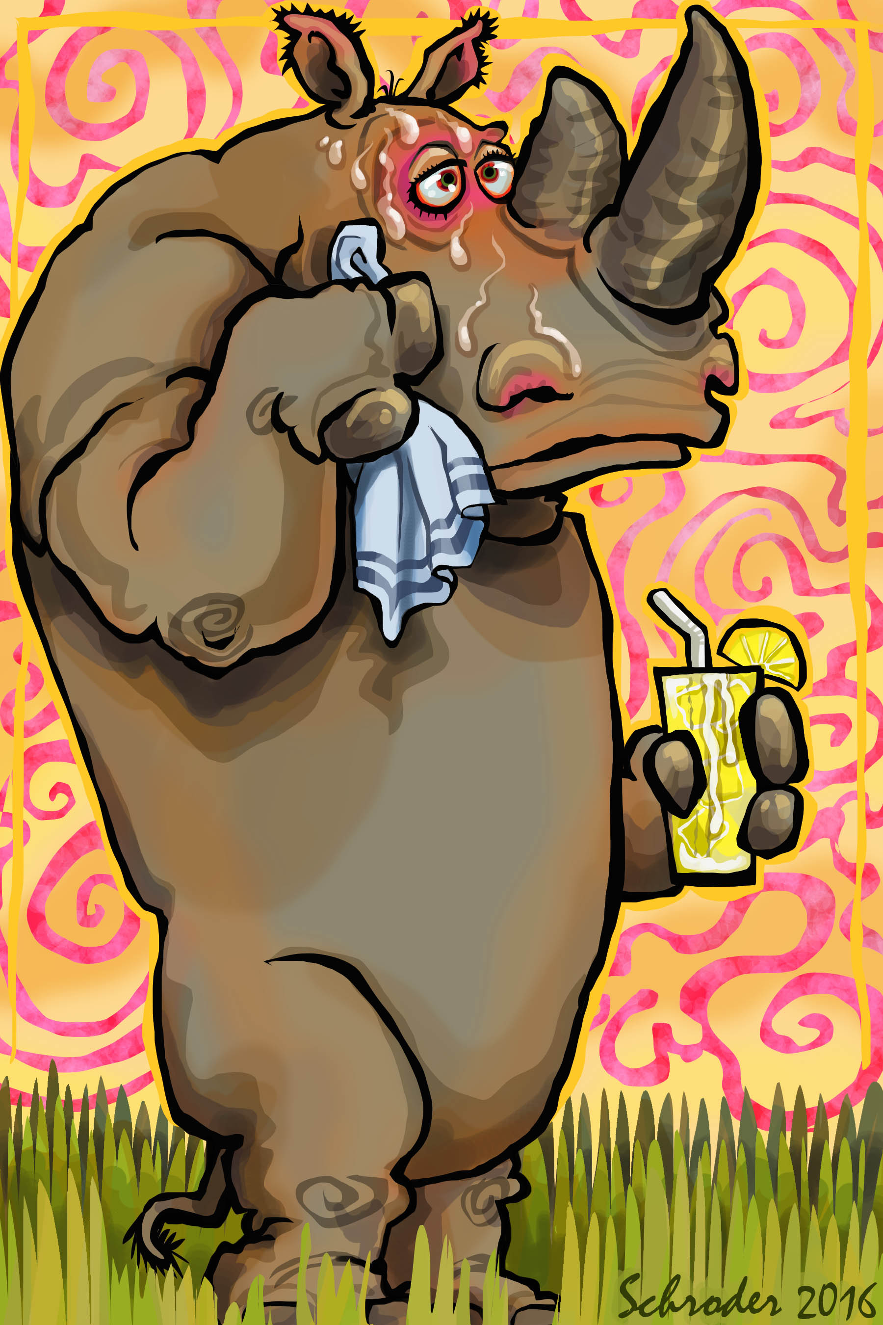 Rhinos all reside where it is toasty. What is peculiar is that We don’t actually sweat in the usual sense, whatever this picture may imply. We keep cool by careful attention to Conditions, and ingenious use of shade, times of day, and energy conservation.