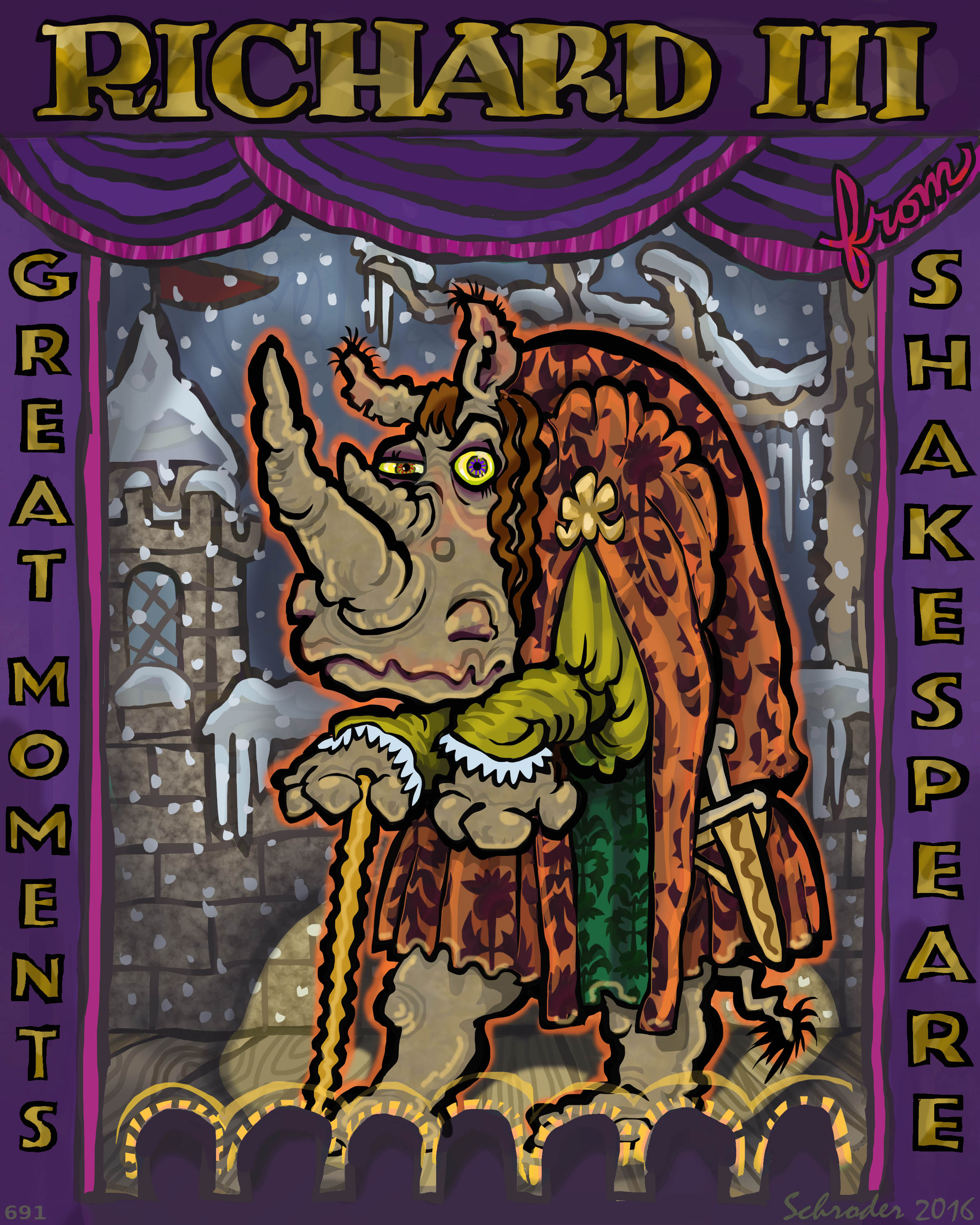 Richard III is a History Play, theoretically detailing his getting the crown. The play presents Richard as cunningly diabolical and also bad. Next-to-nobody survives, mostly thanks to his schemings.
