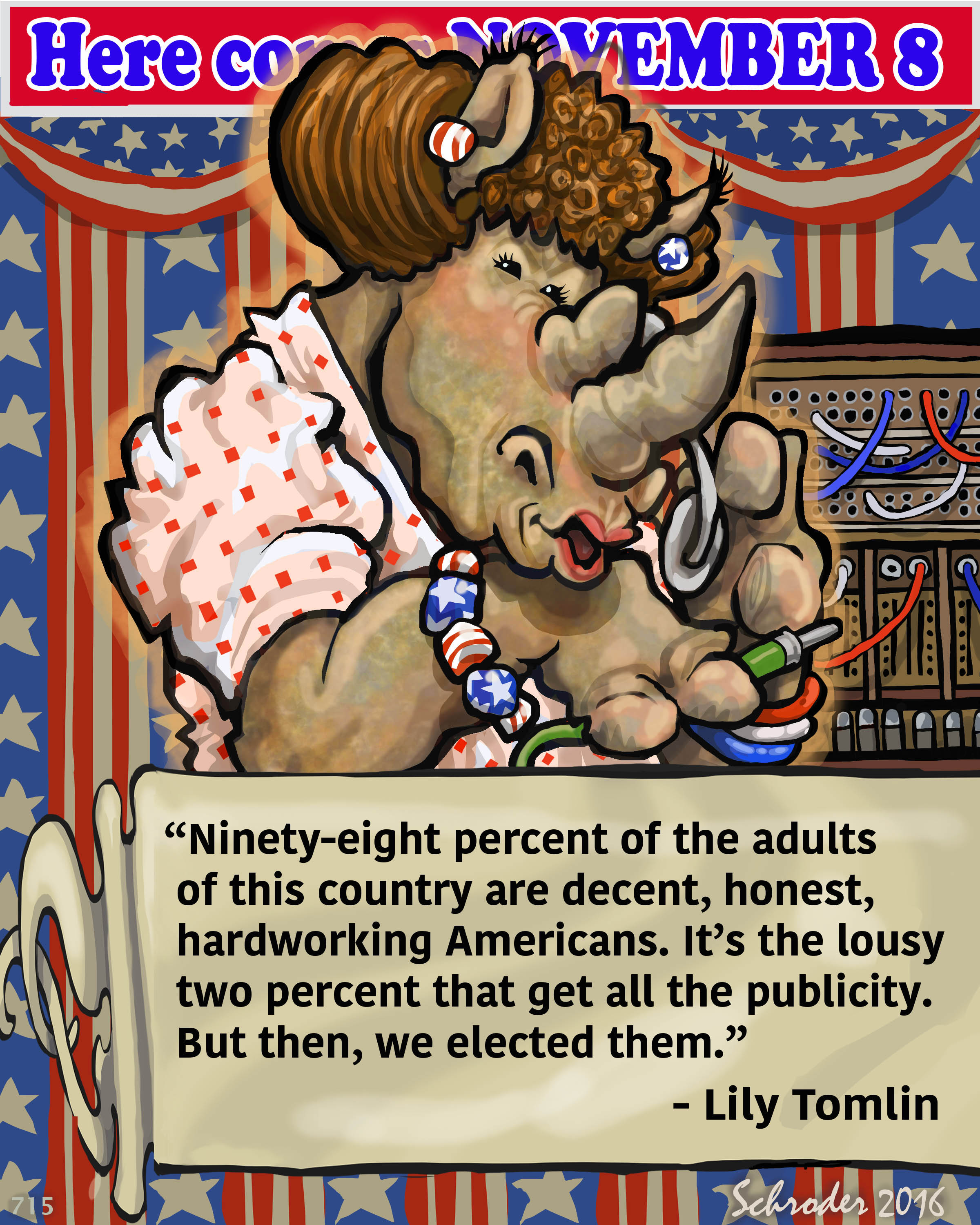 Politix 12 October 21, 2016 by Bill Schroder in R Life Lessons, R Outlook, R vs History Lily Tomlin is an amazing comedian, sharp, witty, and humane. Shown here is Ernestine, a character she made famous on Laugh-In, a 1970s TV show. Ms. Tomlin has a lot of Inner Rhino going on there, We must say. Brilliant. Share this: Click to share on X (Opens in new window) X Click to share on Facebook (Opens in new window) Facebook Like Loading... Related