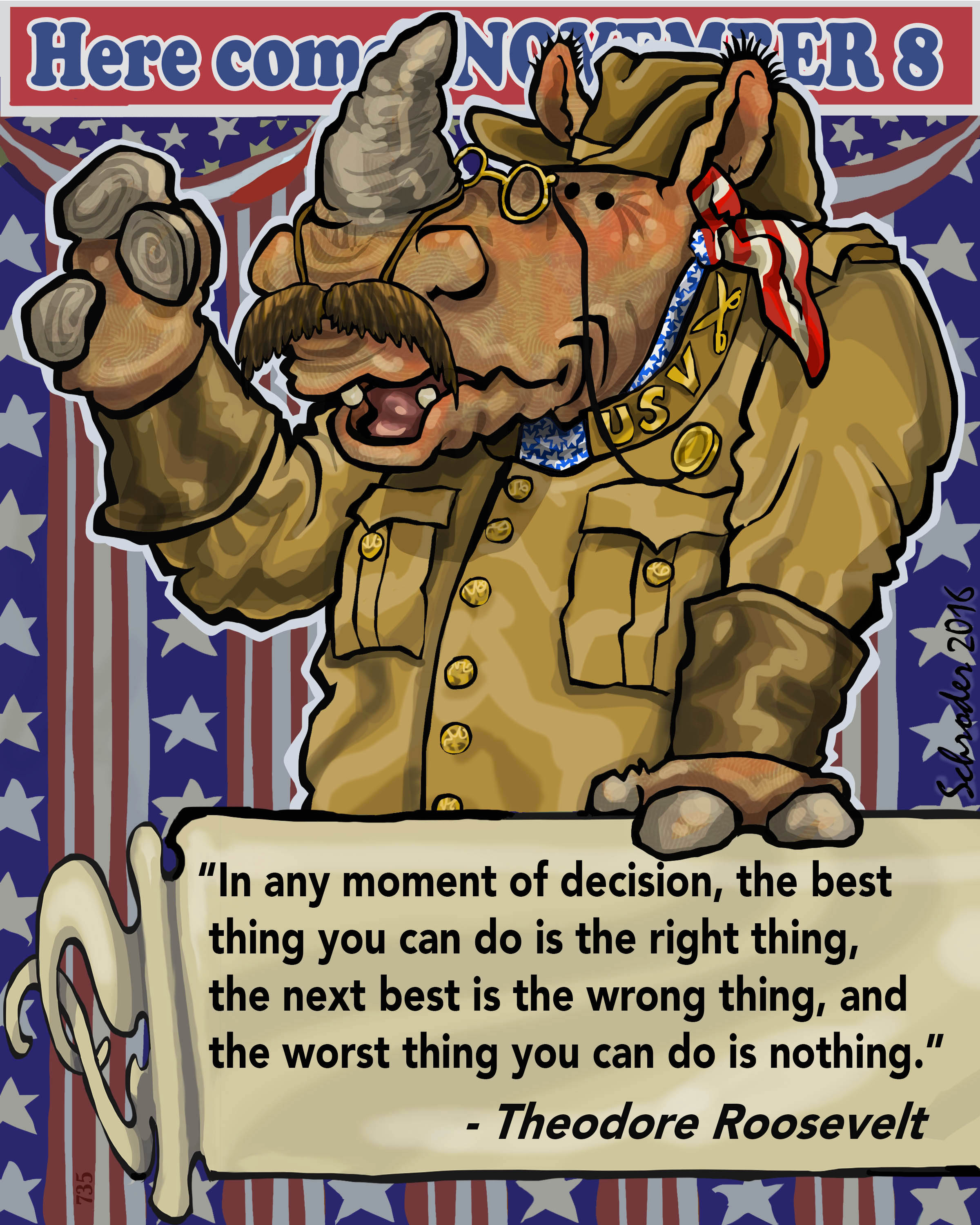 Politix 27 November 5, 2016 by Bill Schroder in R Mindset, R vs History Theodore Roosevelt was the 26th President of the United States. He had a lot of restless energy and faith in direct action. He was also a naturalist and conservationist; Rhinos are all for Gusto, and Mr. Roosevelt had it. Bully! Share this: Click to share on X (Opens in new window) X Click to share on Facebook (Opens in new window) Facebook Like Loading... Related