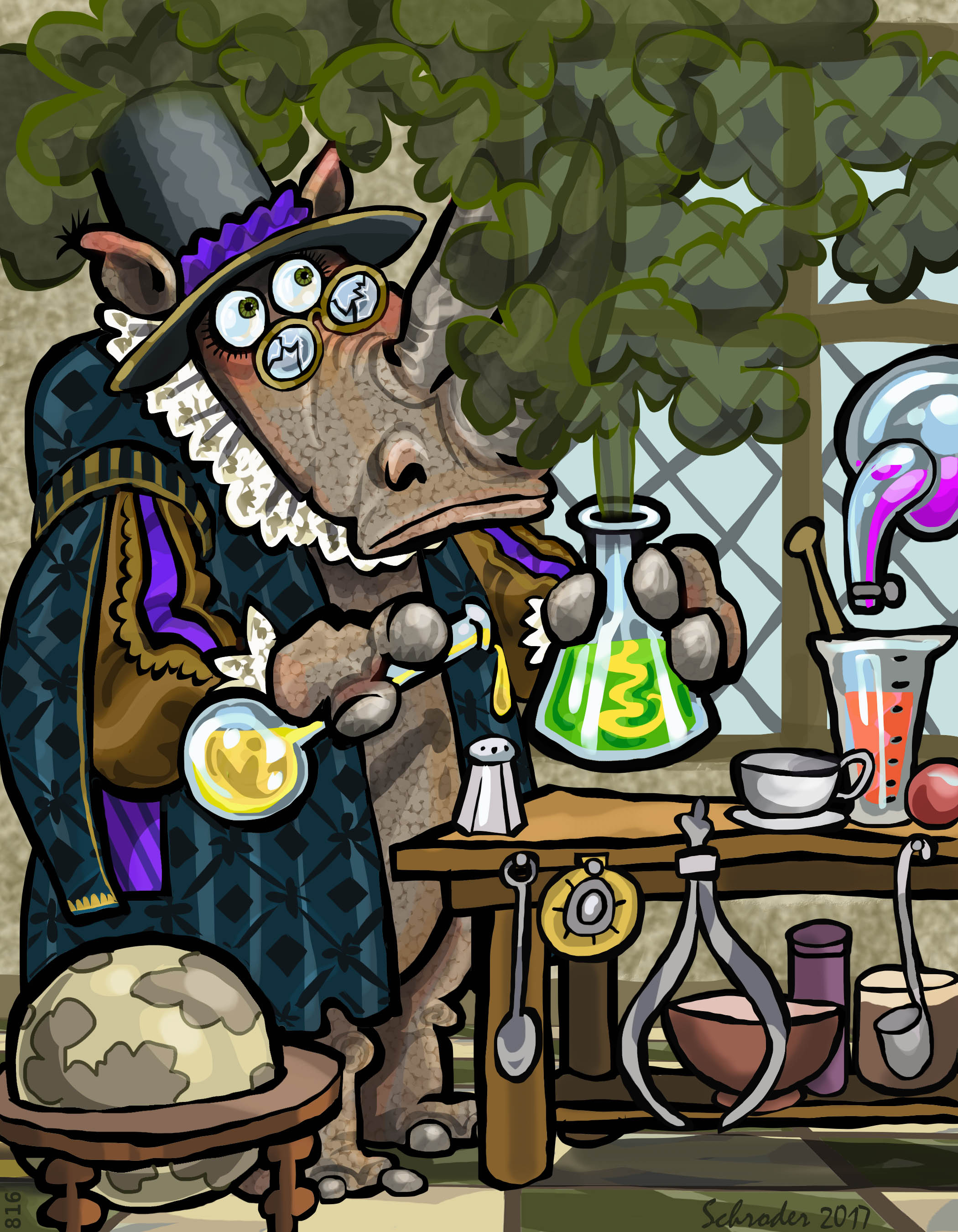 1. This is one of those magical drawings that a person (at least, this person) can look and look at, and still not see it all. What, for instance, is the round object hanging between the spoon and the caliper? Why the condiment shaker? (Does Sir Rhino eat and experiment at the same table?) Do the smoke and shattered eyeglasses mean Sir Rhino has narrowly escaped serious injury from a self-inflicted explosion? These and many other questions await further exploration. Yay!