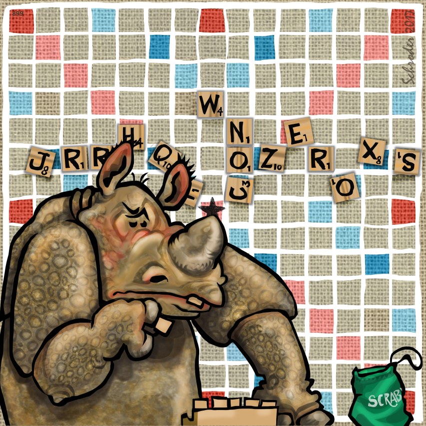 Rhinos are not good at SCRABBLE, since We can neither spell nor count. We like the little tiles though, and the board is pretty. One advantage Rhinos do have: We play equally well in all 29 languages SCRABBLE comes in.