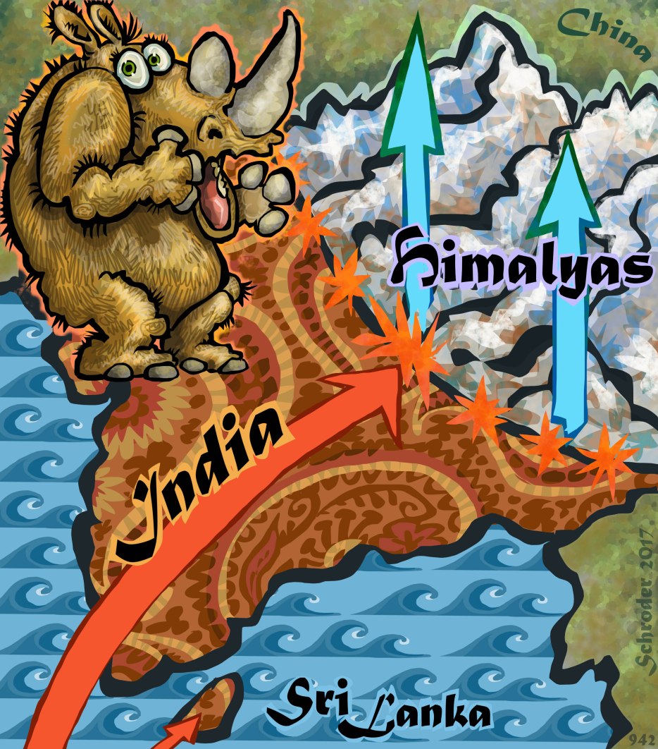 India used to be somewhere else, but 70 million years ago it headed off for Asia, arriving with much Wallop; in this case, the crunching and raising of the Himalayas. A Very Big Ba-Boom!