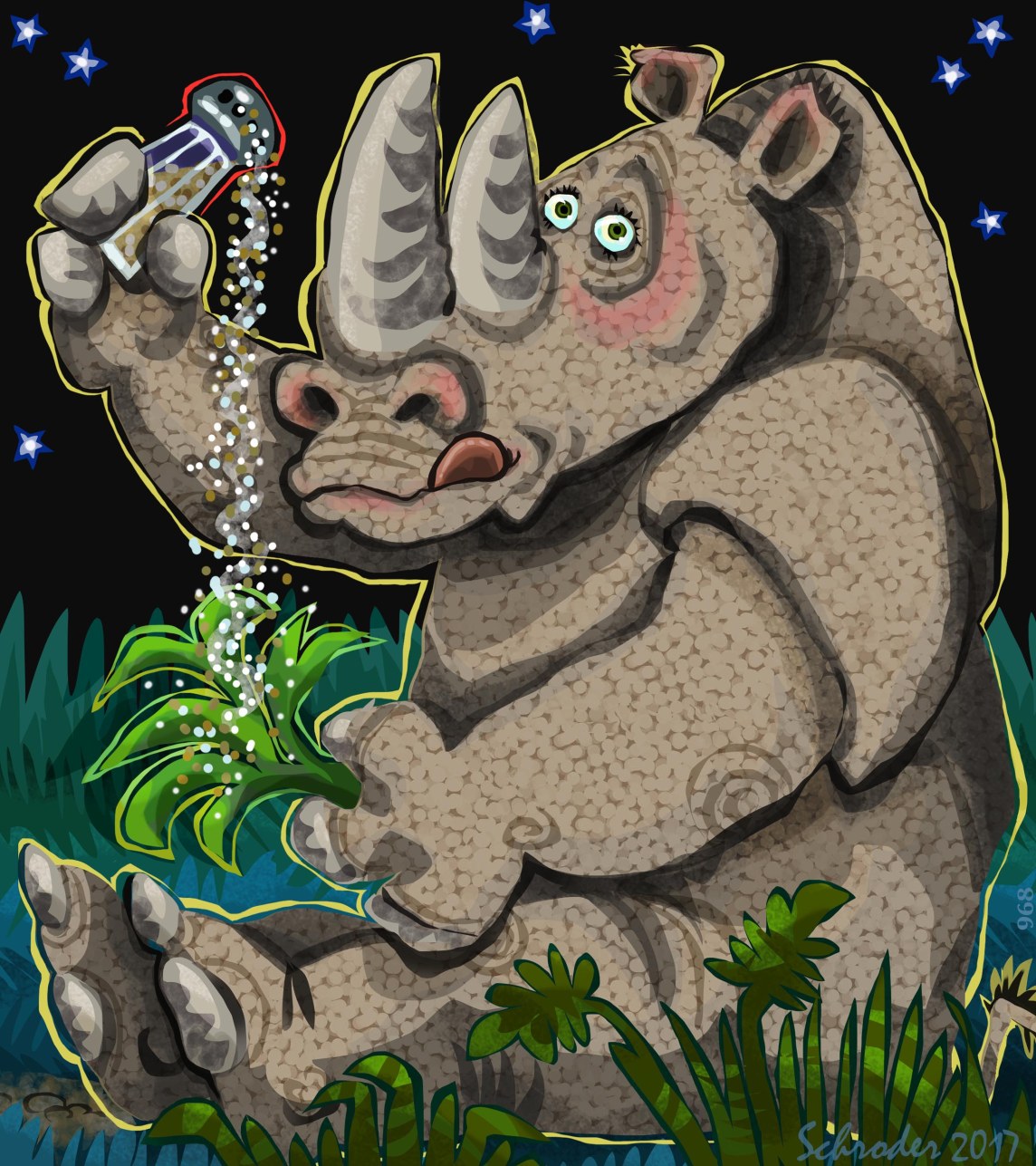 We Rhinos need Salt (and other minerals) to help our digestion, but our options are limited in the Wild. We depend on the environment producing exposed earth containing these minerals. It’s a good system, all in all, and We do fine. We are always on the lookout.