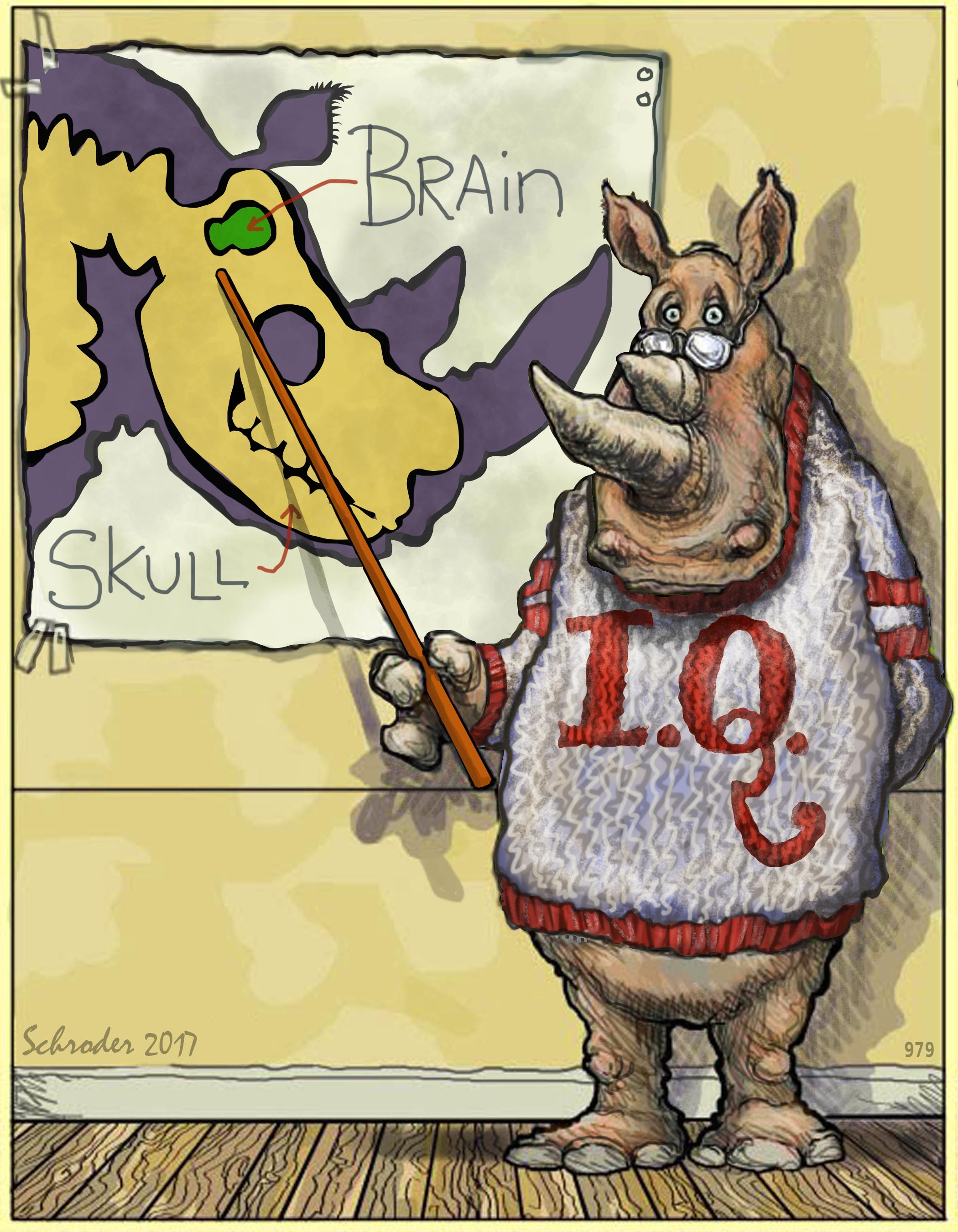 Obvious reservations present themselves: Maybe 1) Rhinos use more of our brain than other critters, 2) We store part of our wits somewhere else, like our kidneys or kneecaps, 3) We don’t fritter away our capacities; We mind our own business. Also Etc., Etc.