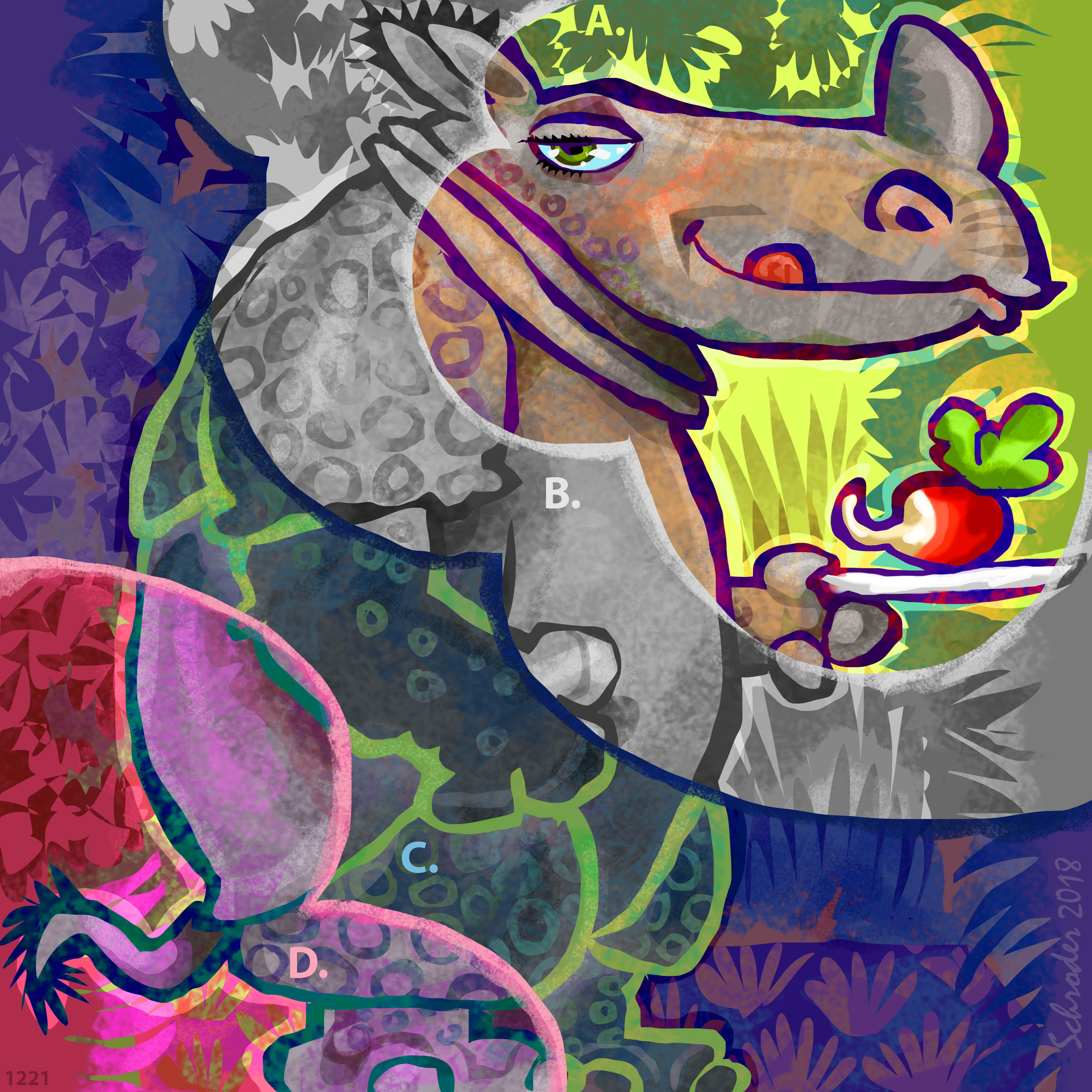 A) Normal Day Vision, when We tune it in, which We don’t do all the time. Color. B) Colorless Vision, useful most of the time. That way, We don’t fatigue our eyes. C) Night Vision, because We are out and about at all hours, hunting and gathering. D) Scent-o-Vision, which is how things Resonate. It is so similar to Rhino Dream Vision, that We skipped further differentiation.