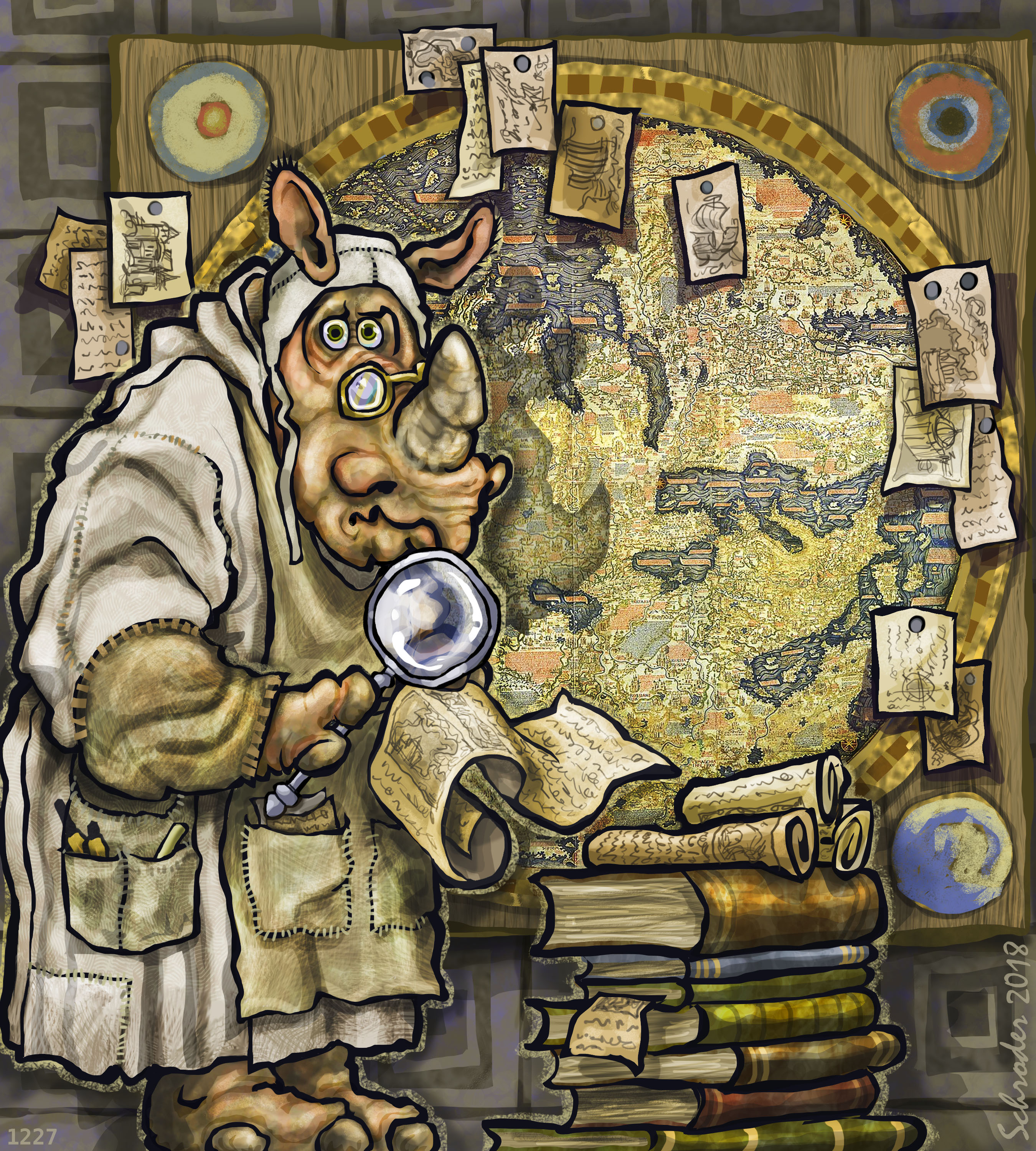 Shown is Fra Mauro (b.1400), a Venetian monk with his famous map, showing the Known World of his day. He worked on it from 1448 to 1459.