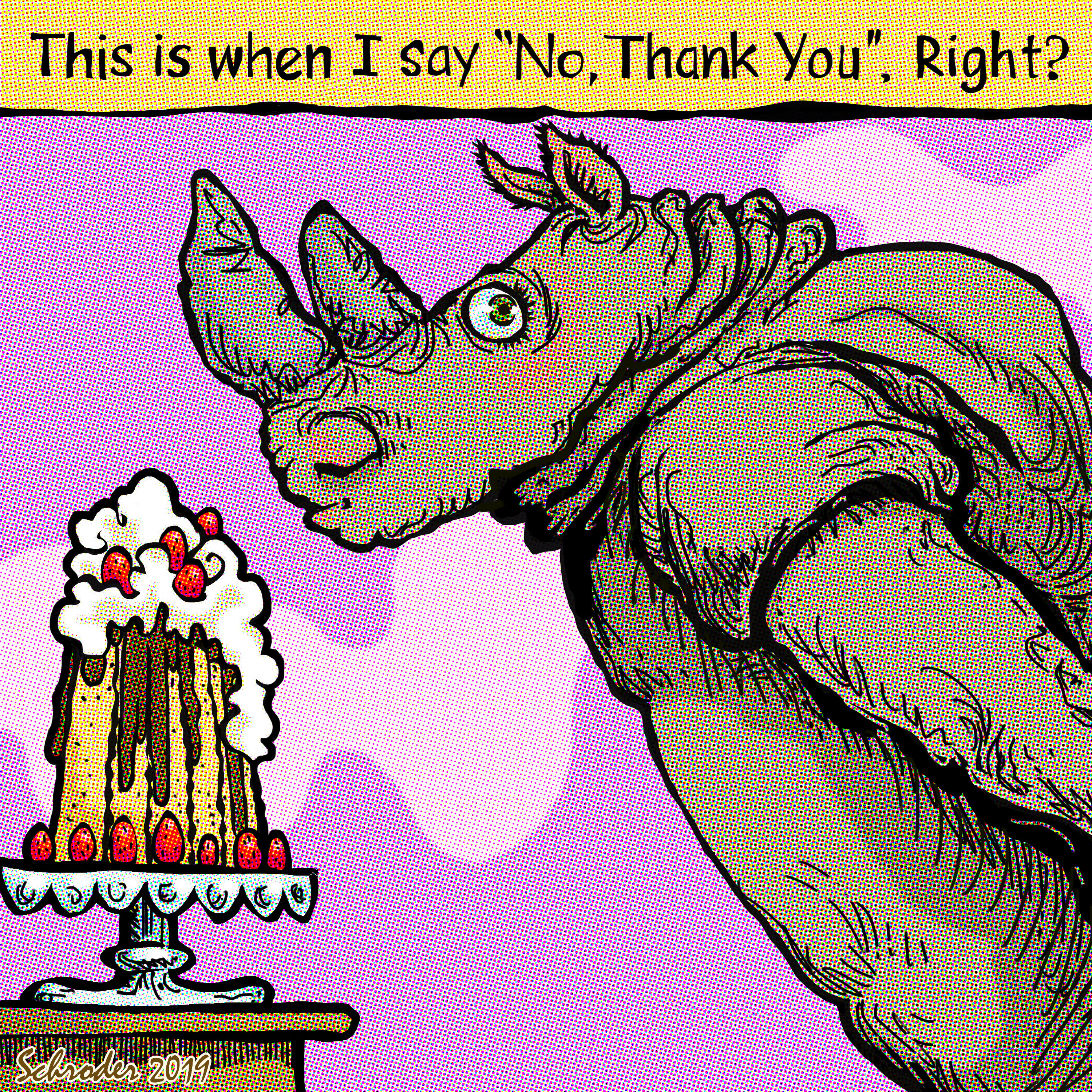 Internal Debate July 25, 2019 by Bill Schroder in Plain and simple, R Attitude, R Life Lessons Dealing with Temptation is a Rhino specialty. We see a Temptation; We yield at once. Why try to fool ourselves that We will withstand the ol’ Come Hither? Big waste of time. Also, somebody else might swipe it while We hem and Haw. Share this: Click to share on X (Opens in new window) X Click to share on Facebook (Opens in new window) Facebook Like Loading... Related