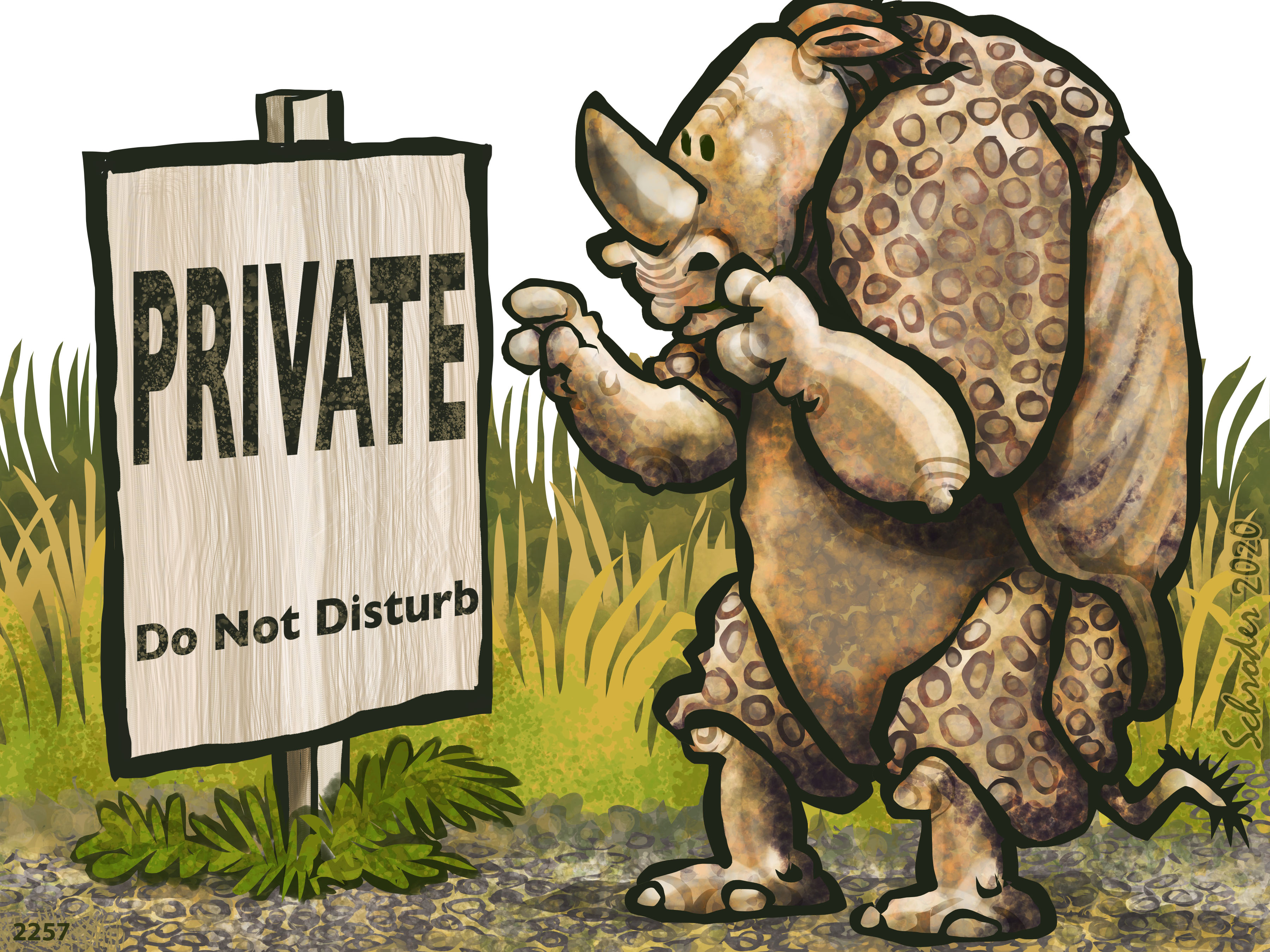 One such concept is Privacy. It means things to our Readers, but to Us, nada. In the Wild, which is how Rhinos are wired, there is no such thing as Privacy. We might be alone for a while, but that is dictated by chance. Rhinos are part of the Big Picture, so We accept our role as one species, however Special, surrounded by many others. The Wild.
