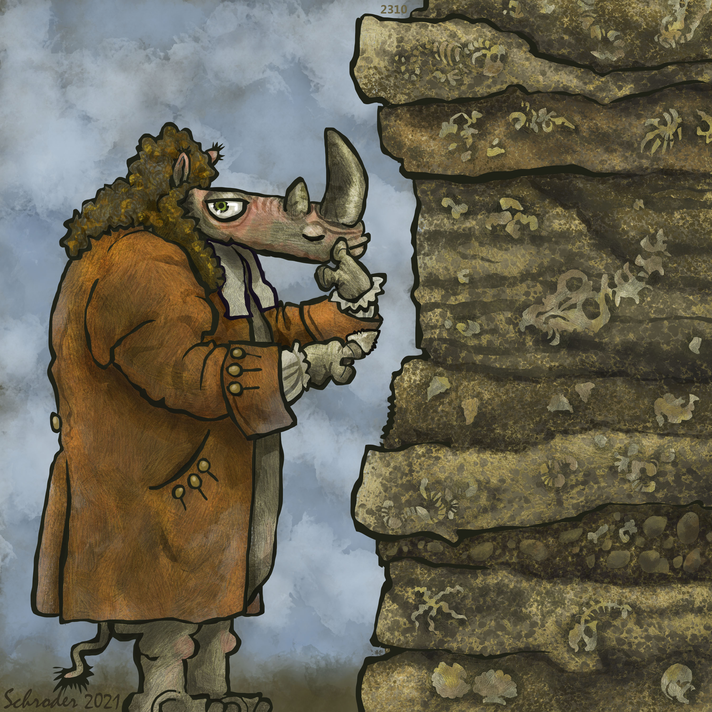 Stratigraphy is the idea that each layer of rock forms on the rock already there, and builds up with time. The new layer is fairly even, but eventually the earth buckles or shifts, disrupting the layers- not in order, but in relative location. By studying these layers, We can see what was going on when the layer formed, what plants and animals are fossilized in each layer. The top layer is the newest. It takes more time than any Rhino could imagine.