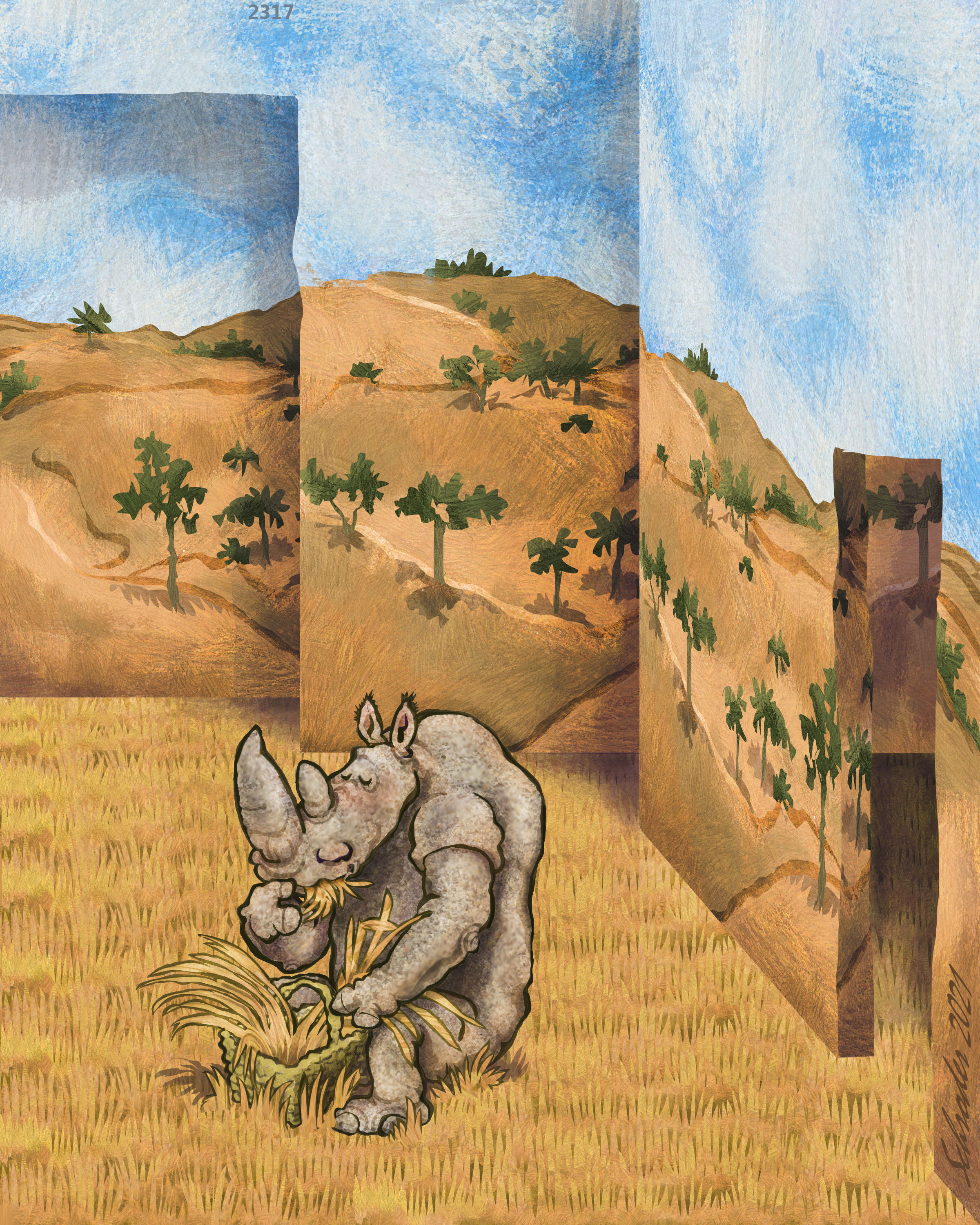 Rhinos are Big Animals. We would be confused if We were not aware of the fact. We eat only vegetable matter, but because We are Bulky, We require a lot of food. In the Wild, each of Us packs their own picnic.