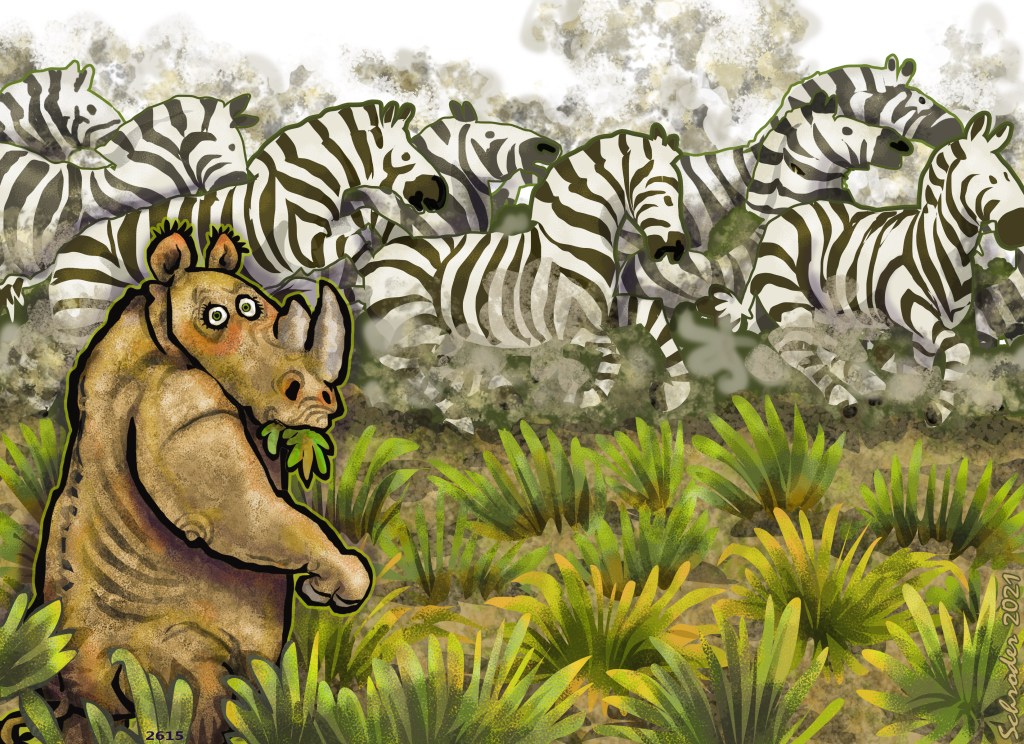 We try to get some information as they thunder past, but if We can’t pinpoint the stimulus, Rhinos mostly follow their lead. Better safe than…