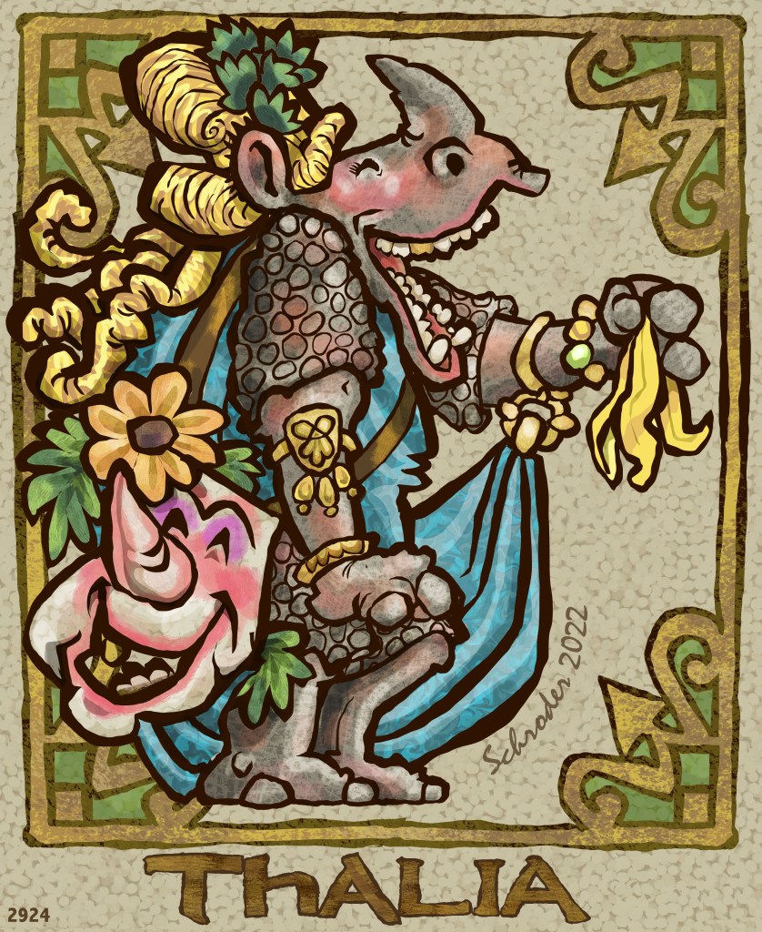 Thalia was the Muse of dramatic comedy for the Ancient Greeks. Like her sister muses, she was helping citizens get some perspective on the ups-and-downs of their lives.