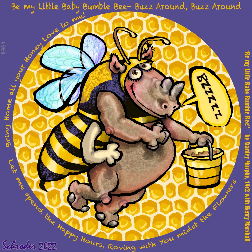 Dress-up Critters October 29, 2022 by Bill Schroder in Uncategorized Rhinos love to disguise ourselves. We are very good at it, if We do say so ourselves (as We must). This outfit is inspired by a 1912 song, celebrating Bees and their merry ways. Irresistible! Share this: Click to share on X (Opens in new window) X Click to share on Facebook (Opens in new window) Facebook Like Loading... Related