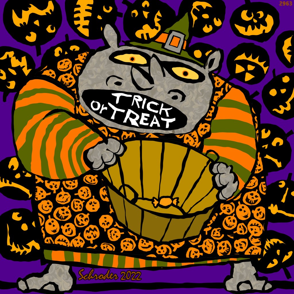 Aaaaaaaaaand We’re off! October 31, 2022 by Bill Schroder in Uncategorized Your Inner Rhino wishes you all a good time Trick-or-Treating this evening. Easy does it, Readers. Sugar can make folks excitable and weird. Share this: Click to share on X (Opens in new window) X Click to share on Facebook (Opens in new window) Facebook Like Loading... Related