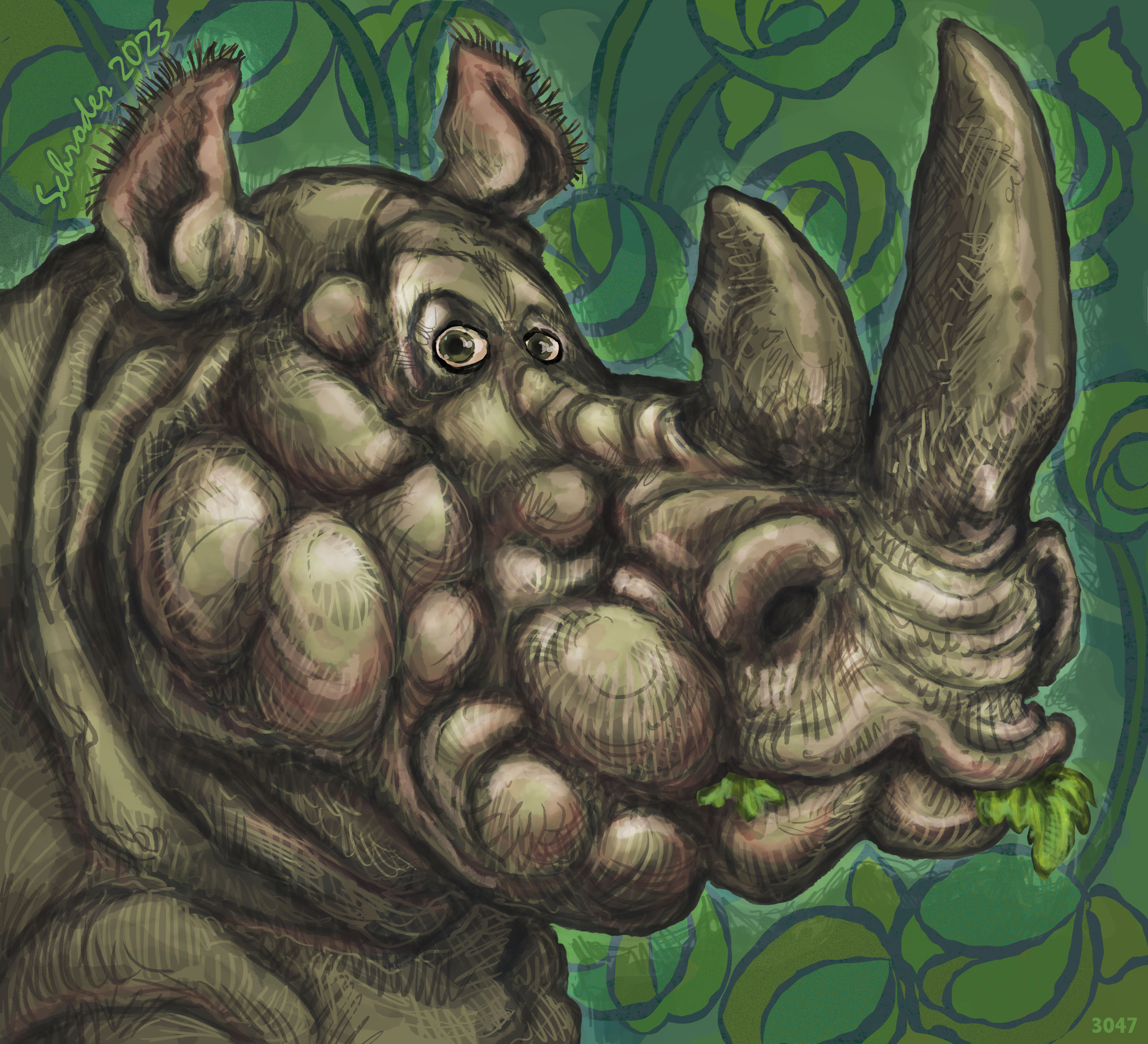 Doubtless you have heard the expression “don’t talk with your mouth full”. There may be places where that directive has meaning, but not for Us Rhinos. We are on duty to eat as much as possible so We can stay trim and vigorous, or get that way.