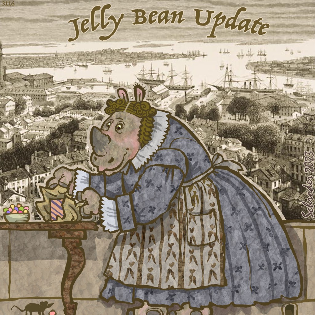 Jelly beans travel well, and are not harmed by being sat upon. This recommends them to Rhinos, who don’t usually examine a place before sitting. And they retain their sweet essence for a Long Time.