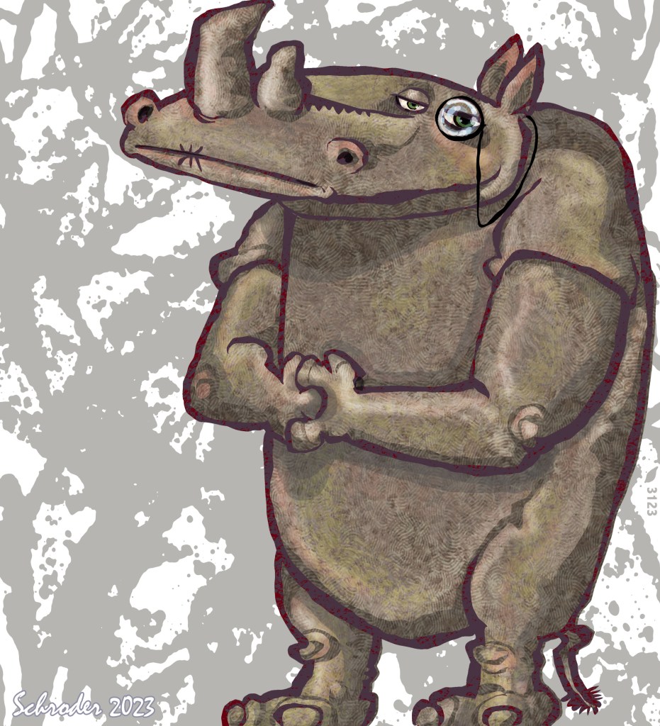 Some other critters get more stomachs so they can chew their cud or whatever, but not We Rhinos. We push things through the system, wrenching every nutirent We can locate from the greenery, and then We let it go at that.