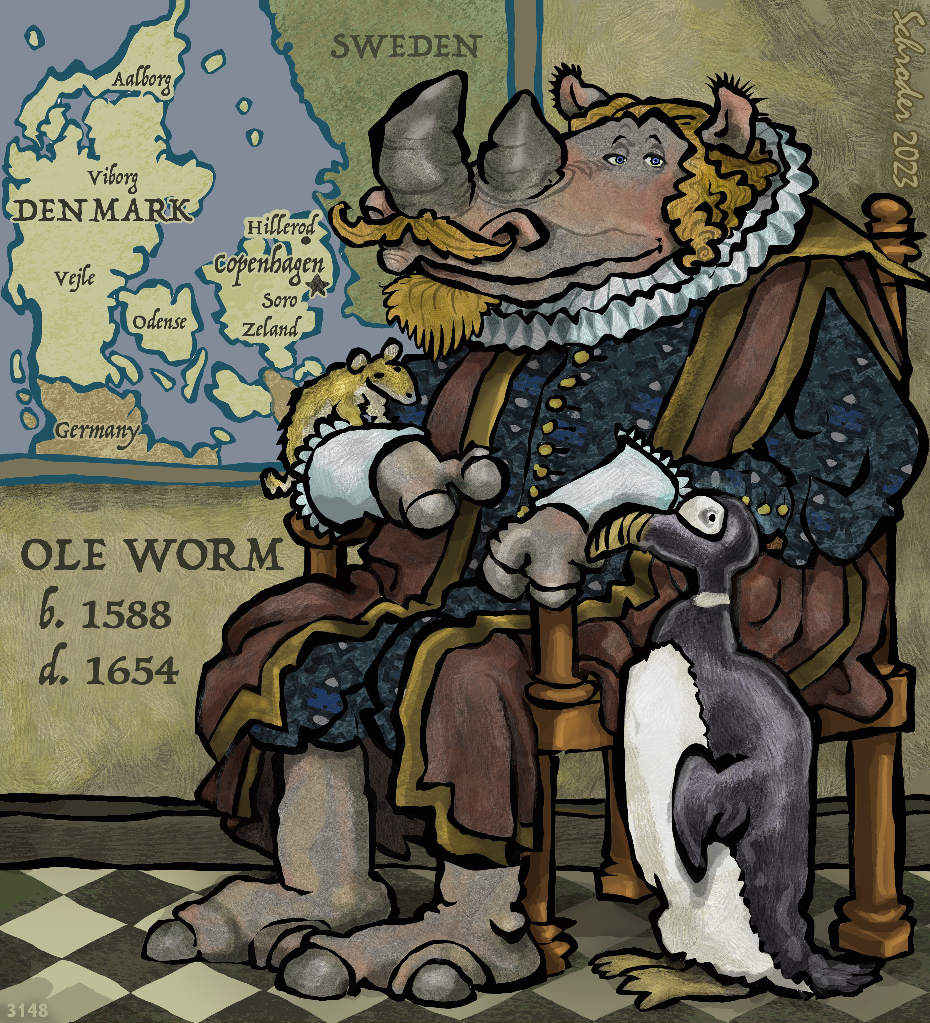 Hr Ole Worm, a Danish teacher, naturalist and doctor, is known for making the first museum of natural wonders in Denmark. The museum included runes, critters, fishes, shells, anthropology bits and pieces, and a pet Great Auk, which modeled for the only picture ever made of a Great Auk alive. Shortly after the drawing, Greak Auks became extinct.