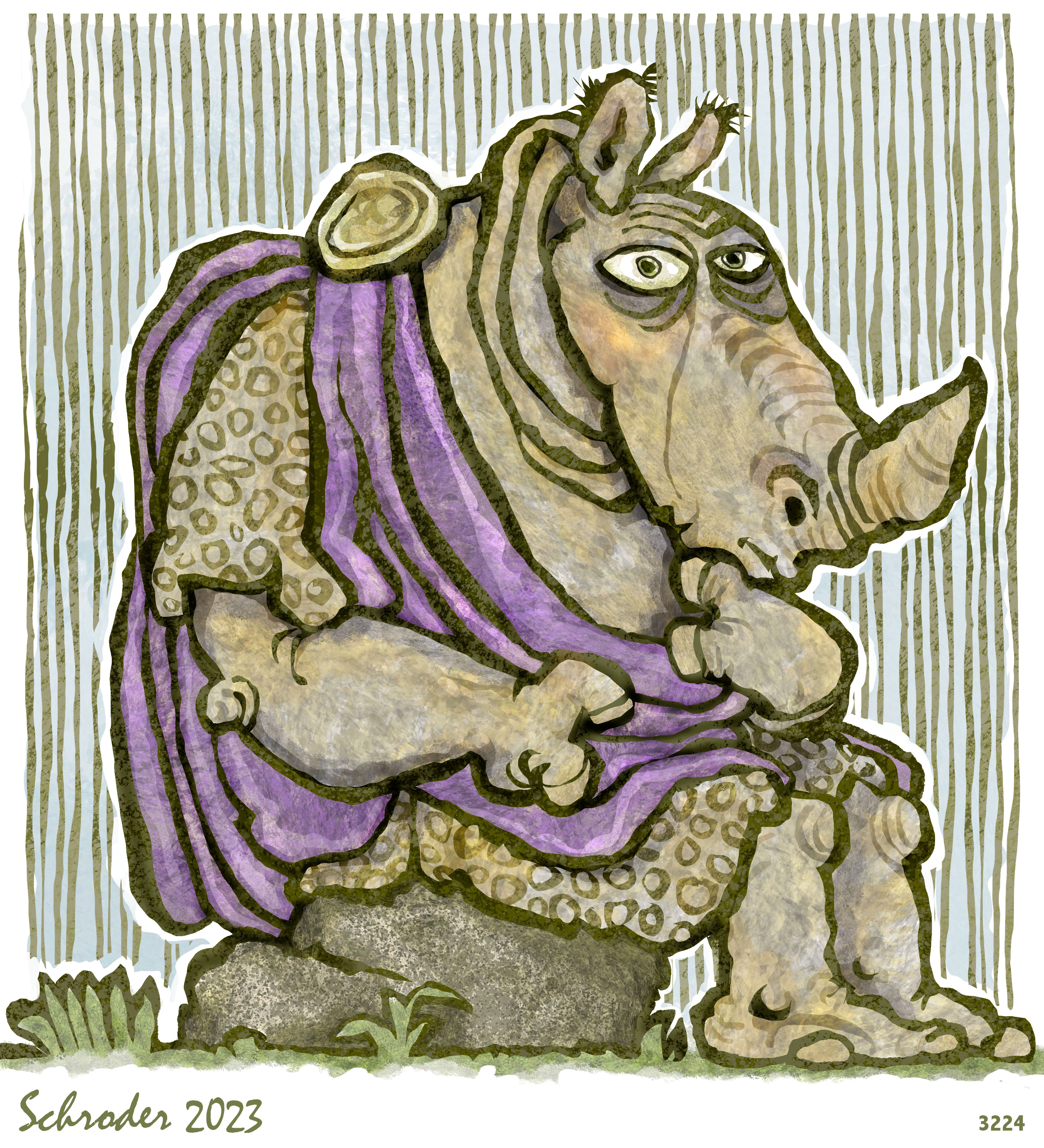 This blog, Your Inner Rhino, is within spitting distance of its nine year anniversary (10/20/2014). In the interest of not going crazy, I think we will use some of the 3,300 pieces of art/themes again, not more than maybe 30%, so I can breathe. Still love to draw and muse, but as they say, there is a Limit… at least for the nonce. PS: We’re still happy to get suggestions, civil ones, for topics of conversation.![]()