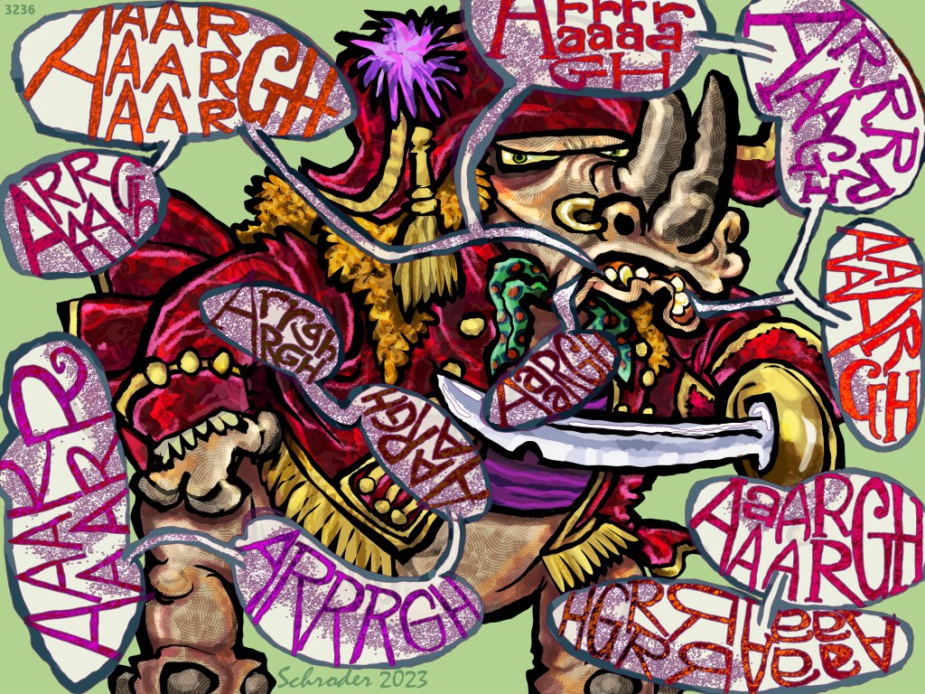 In today’s illustration We have skipped Billy Bones and shivered timbers references, and cut right to the essence of the business, the “Aaaaargh”. Time spent practicing is never wasted, and various rhythms, volumes, and accents are all possible, once you get your bearings. In sum, you should aim for a growl or roar. Get that into your repertoire, and you are set to chat with other would-be pirates.