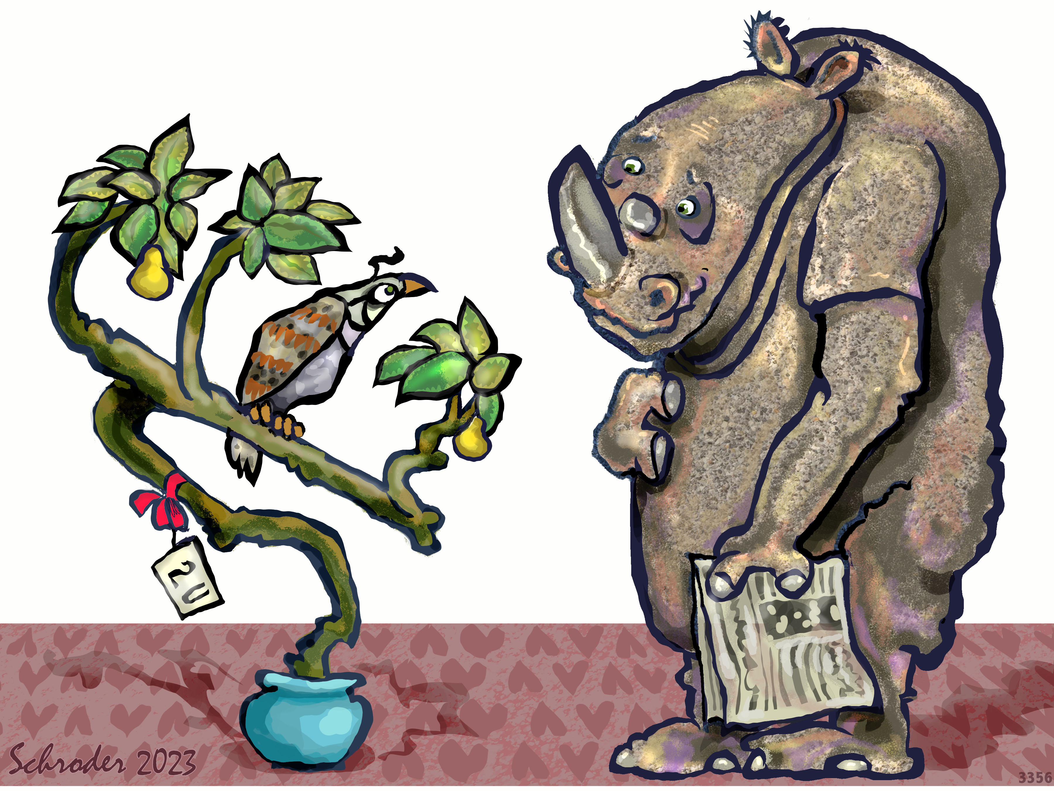 Special Delivery December 26, 2023 by Bill Schroder in Uncategorized We just recalled the song “On the first day of Christmas, my true Love sent to Me”. Followed by other things the True Love delivered. Ah ha ha, you say. Giggle now, see it later! And Awaaaaaaay We go… Share this: Click to share on X (Opens in new window) X Click to share on Facebook (Opens in new window) Facebook Like Loading... Related