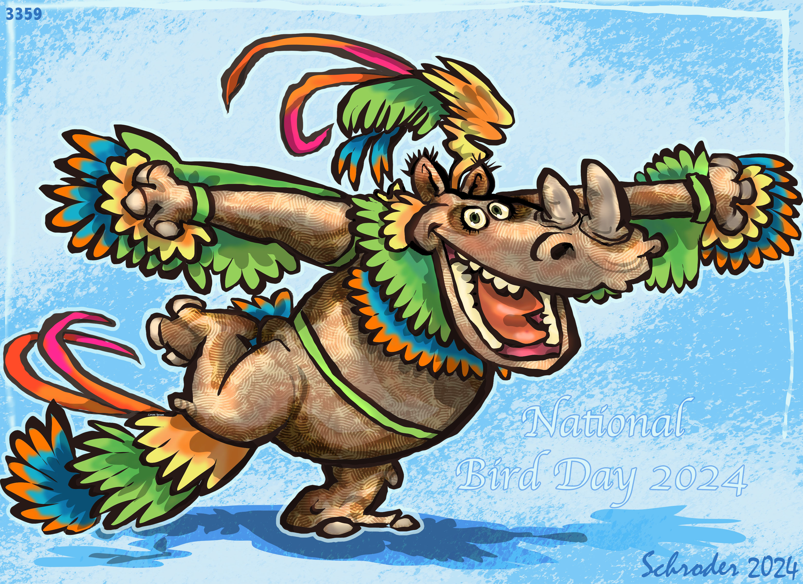 Today still is, albeit not for long, National Bird Day 2024. Rhinos are almost all bird enthusiasts, and We hail their accomplishments, virtually daily. They have quite a repertoire of talents.