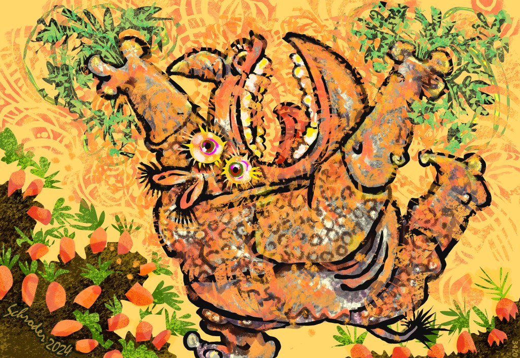 We are all for Carrots, and are constantly surprised at how much they improve our night vision. They do, honestly. Our diet plan is demanding, and if We had to stop chomping at twilight, or wait til full dawn to nibble, We Rhinos would shrink. And therefore, be unhappy. Or worse, moody.