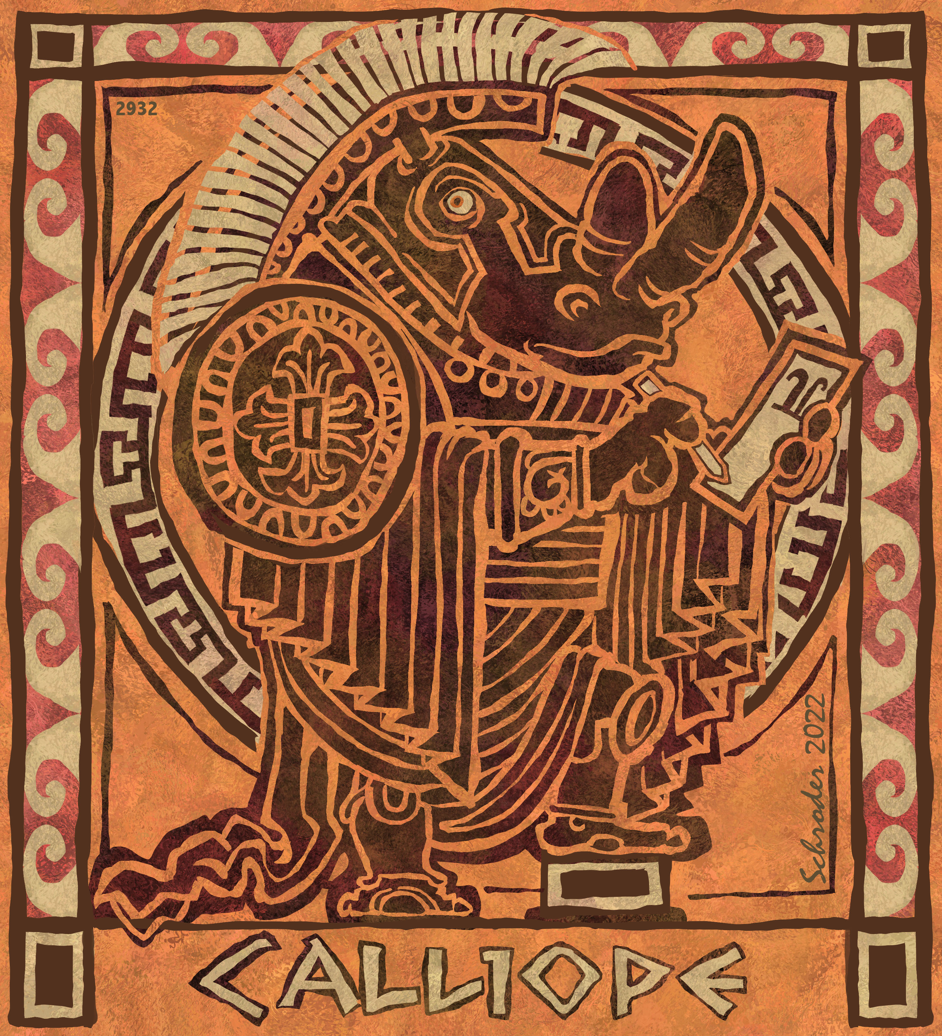 Calliope was the muse of Epic and Heroic Poetry. Theoretically, she is the oldest of the nine muses, but Rhinos have always wondered if that rumor was prompted by one of her many sisters.