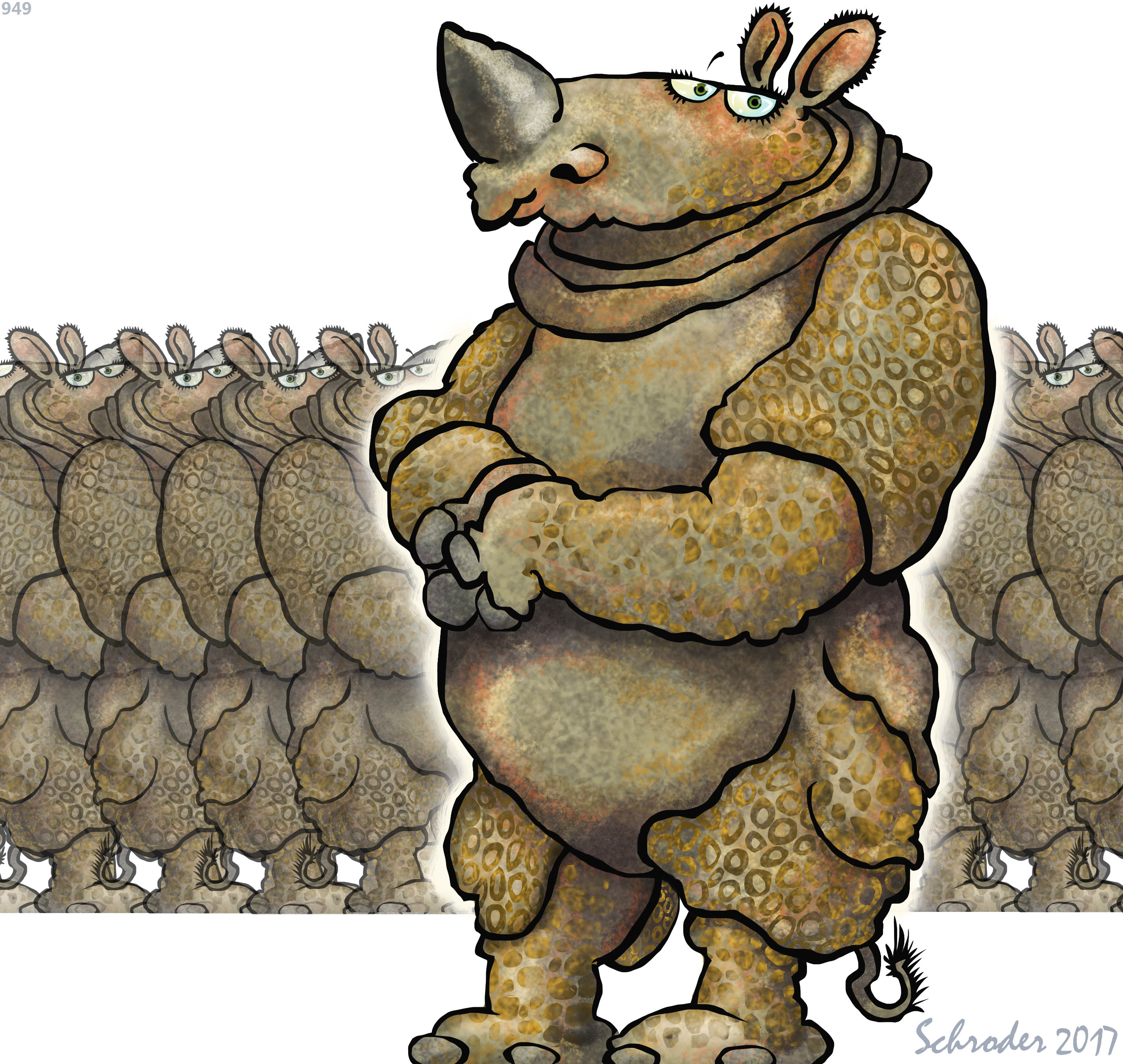 Rhinos do not run late, and that’s a fact. This is due to a happy coincidence of factors. 1) Agitation can lead to weight loss, which Rhinos frown upon, 2) it would not occur to Us to make an appointment, and 3) We cannot tell time.