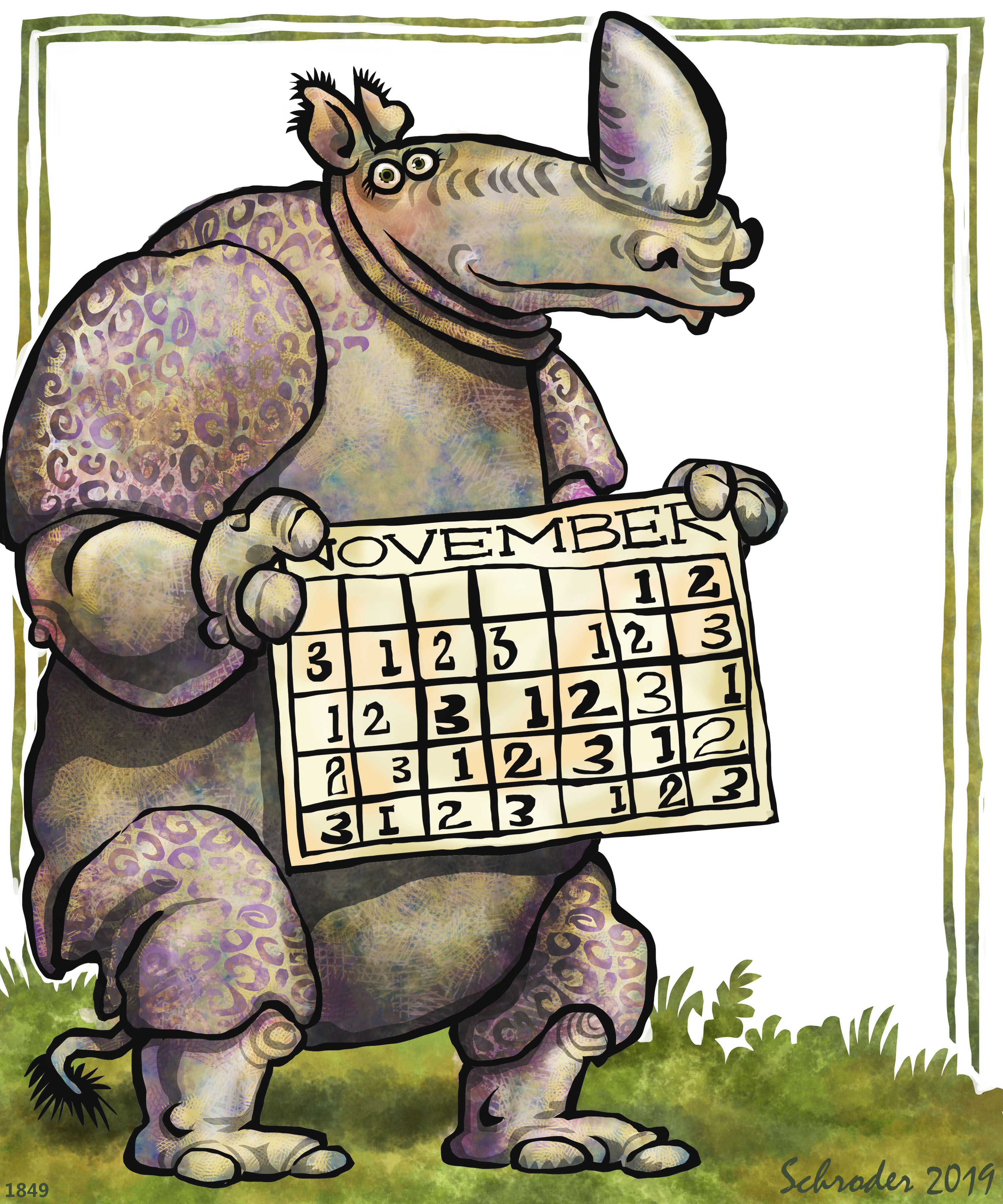 But November is different in various places. Some places it’s chilly; others, it’s toasty, dry, or damp. It’s a lot to wrap a Rhino’s head around.
