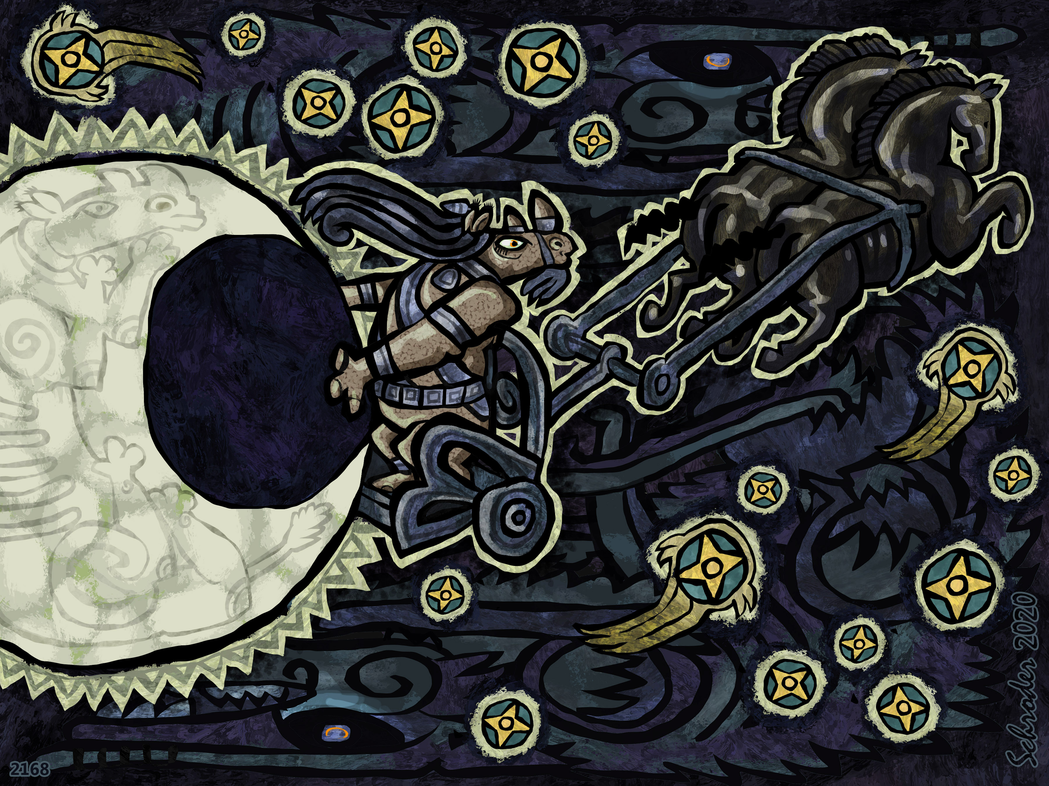 The ravenous wolf for Mani is named Hati (meaning ‘hatred’). On the Final Day (Ragnarok), Hati will catch and devour Muni.
