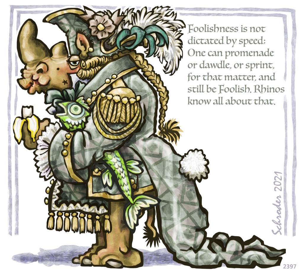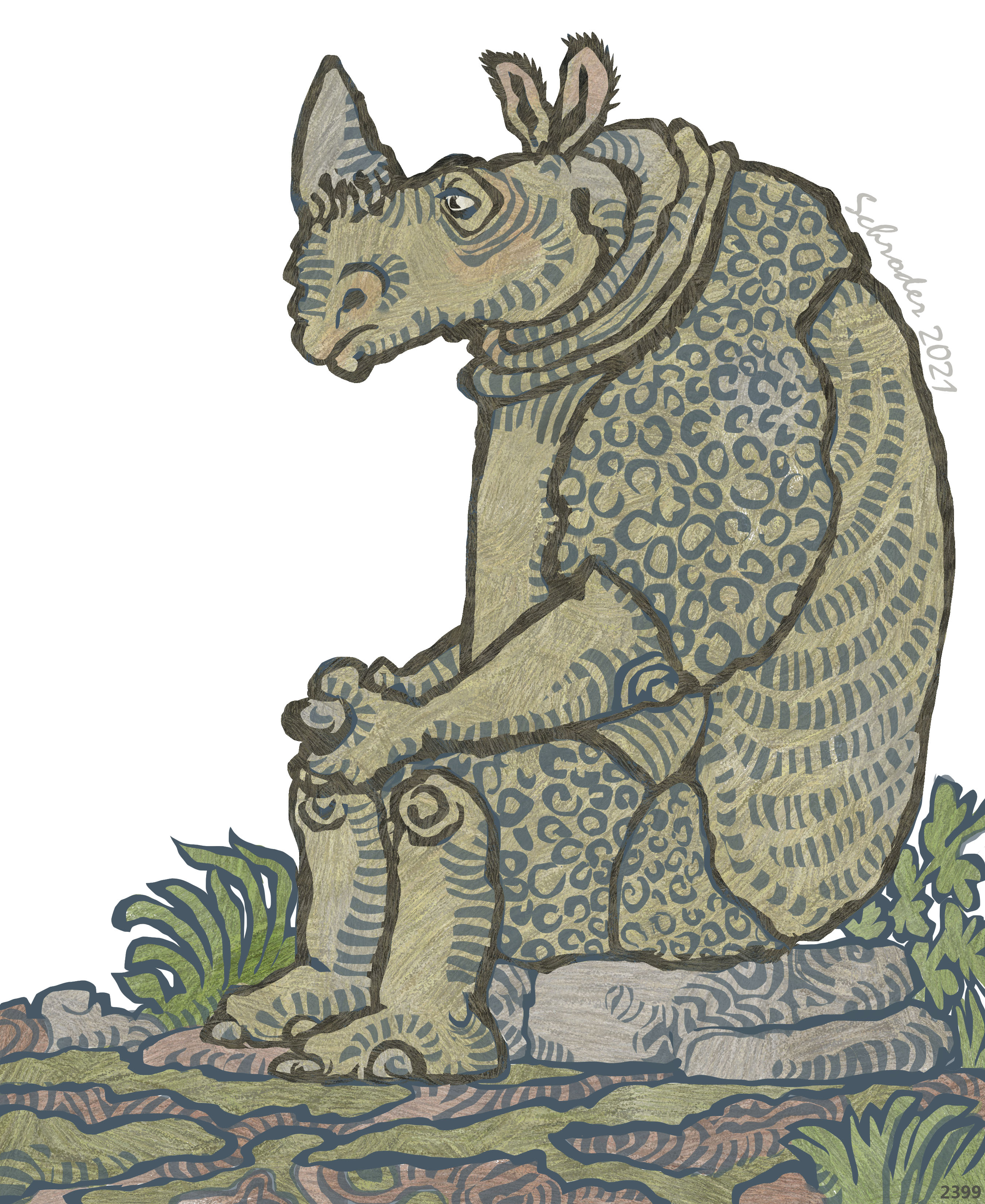 Among Rhinos there is a popular idea that Long Ago, We lived for much longer than We do today. Maybe centuries or eons or millions. More than Three, at any rate. Rhinos simply have hazy concepts of longevity. It has never intrigued Us.